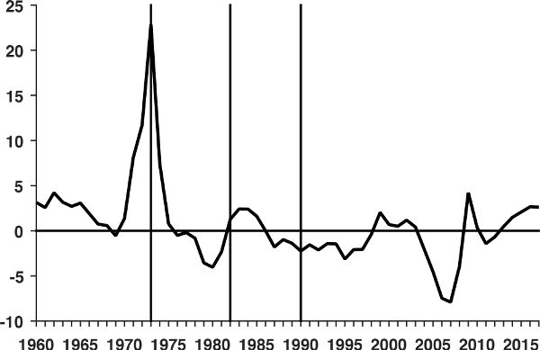 The third phase, from 1982 to 1990, is again a severe bust-boom cycle episode. This phase, however, has two features that are different from the previous episode. The first is that the fiscal discipline, implemented in the mid-1970s, was still present for most of the time. As shown in Figure 3, in this phase the fiscal deficit was almost zero: 0.1 percent of GDP on average. The second difference is that inflation increased substantially but did not return to the hyperinflation levels of the early 1970s. As shown in Figure 2, inflation increased from 10 percent in 1982 to 27 percent in 1983. It remained at this level during the whole period. Overall, the main feature of this phase is the deep and long recession that affected the economy. In particular, as a result of the severe balance of payments crisis of the early 1980s, real per capita GDP declined by 20 percent between 1981 and 1983, as shown in Figure 1. Then, it gradually recovered so that in 1990 per capita GDP was at the same level as in 1981.