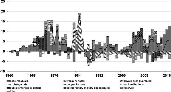 To summarize, in the latter stage of Pinochet’s government, fiscal financing needs were determined mostly by the fiscal debt the Treasury acquired with the central bank. With the exception of the years when the crises were at their peak, fiscal deficits were absent in this period. In the same way, external and domestic (private) debt were not important sources of funding (Table 1).