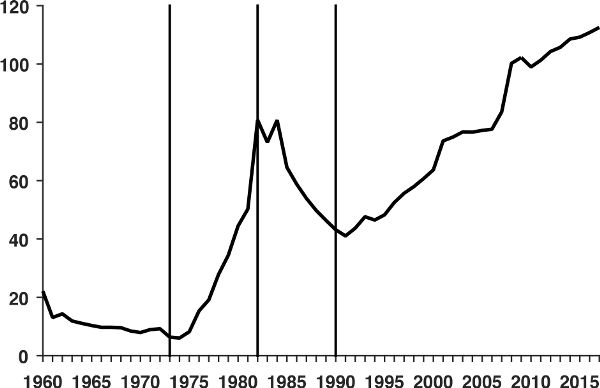 The policy efforts after the financial crisis were concentrated on putting the country back on the growth path and fortifying the financial system. The contraction of GDP in 1982 and 1983 was severe, as shown in Figure 1. The main focus of the policies implemented soon after this recession was on solving the balance of payments crisis along with the financial crisis. To that end, the fiscal authority and the central bank designed a program to rescue the private banks. In this context, the central government implemented austerity measures with two objectives in mind: to prevent an increase in the fiscal deficit and to be able to support the rescue plans of the private sector. These austerity measures were difficult to implement and, of course, were very unpopular. In the end, however, these painful measures worked. In particular, from 1984 to 1990, the rate of growth in per capita output was positive and employment recovered. The emphasis on controlling inflation was diminished, and from 1984 to 1990, inflation was much higher than in 1982, when it reached single-digit values. Despite this fact, inflation was relatively stable and below the hyperinflation levels of the early 1970s.