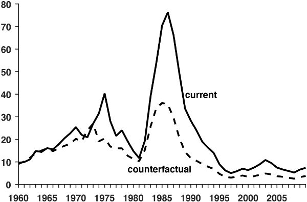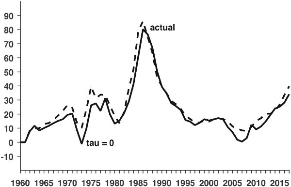 The role of public debt is also crucial to determine the magnitude and sources of implicit transfers. As seen in Figure 9, public total debt increased substantially in the early 1970s and early 1980s. This correlation does not necessarily reflect causation, as it may be driven by exogenous shocks. For instance, the exchange rate depreciation in the mid-1970s determined an increase in the ratio of external public debt to GDP; however, if we fix the exchange rate level and generate a counterfactual path for the external debt (see Figure 10), we can see that the increase in the debt position of the government is driven not only by policy decisions but also by exogenous shocks. Public debt is also influenced by the implicit transfers, as these represent a liability; they increase the debtor position of the government. To illustrate this point, in Figure 11 we present an exercise in which the level of implicit transfers, denoted τt in “A Framework for Studying the Monetary and Fiscal History of Latin America,” is kept to zero in each period. As is clear, in this counterfactual scenario, the debt position of the government could have been substantially lower, especially in the 1960s and 1970s.