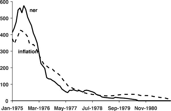 After three years in which the exchange rate was fixed, inflation declined to single-digit numbers: 9.5 percent in 1981. The fact that the exchange rate was controlled helped explain the important decline in inflation. In particular, the nominal anchor of the economy was the nominal exchange rate. As shown in Figure 5, from 1975 to 1981 inflation and nominal devaluation, on a year-on-year basis, moved together. The contemporaneous correlation among these variables is high: 0.96. This behavior is determined by the introduction, in January of 1978, of a preannounced rate of devaluation, the so-called tablita. This system set the starting declining rate of devaluation at a lower level than ongoing inflation, with the aim of reducing inflation expectations and reducing actual inflation as long as the law of one price held. For instance, in 1978 the minister of finance, Sergio De Castro, announced that the rate of devaluation for 1978 had been determined at 21.4 percent and would decline further in the future. The tablita lasted until June 1979, when the nominal exchange rate was fixed.
