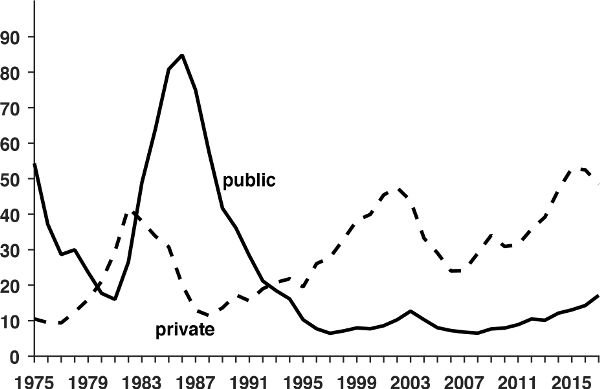 The crisis that followed the phase of economic euphoria described above put the banking system at severe risk. As noted previously, the main debtor with the rest of the world was the private sector. Between 1975 and 1982, the private foreign debt, as a percentage of GDP, increased from 10.5 percent to 41.8 percent. In the same period, the public external debt declined from 54.3 percent to less than 27 percent (see Figure 13). An important part of the private external debt was intermediated by domestic private banks, and a currency mismatch emerged in their balance sheets. The sharp depreciation of the peso, in the context of a severe recession, made many banks insolvent. They could not recover an important proportion of their credits and, as a consequence, were unable to repay their foreign loans.