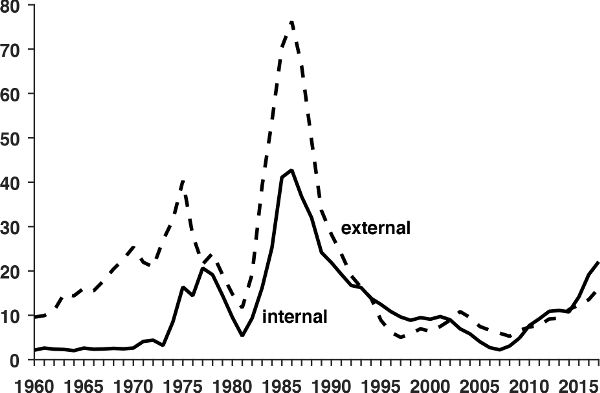As documented in Reinhart and Rogoff (2009) and related to the balance of payments crises, during the 1960s three external debt restructuring episodes occurred. Those were implemented through International Monetary Fund programs in 1961 and in 1963 to 1965. They may explain the fact that in the first half of the 1960s, the external sources of funding were not very important (less than 1 percent of GDP).