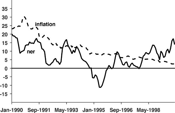 Now, there is a view among some economists, such as Calvo and Mendoza (1998), that the exchange rate appreciation helped stabilize inflation during the 1990s. We tend to disagree with this hypothesis and believe, as shown by Valdés (1998), that the nominal anchor from 1991 to 1999 was indeed the declining inflation target announced by the central bank. We will provide some evidence of the joint behavior of inflation and exchange rate that supports this hypothesis.