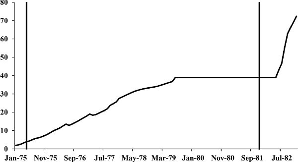 Figure 1 presents monthly data on the peso–U.S. dollar exchange rate between January 1975 and December 1982. The dates of Friedman’s two visits (April 1975 and November 1981) are denoted by two vertical lines. Four phases of exchange policy in Chile during these years may be detected in the figure. The first phase goes from January 1975 to February 1978. During this period, Chile followed, for the most part, a passive, backward-looking, crawling-peg regime.4 The nominal exchange rate was devalued frequently (daily) by the lagged (previous month) differential between Chilean and U.S. inflation. During the second phase, from February 1978 to June 1979, the tablita, or preannounced crawling peg, was in place. As may be seen, the slope of the peso-dollar curve becomes flatter, reflecting the deliberate slowing down of the rate of devaluation, below the ongoing rate of inflation. The third phase, from June 1979 to June 1982, is the fixed peso-dollar rate, and the fourth phase, after June 1982, is the devaluation crisis and the adjustable and managed peg.