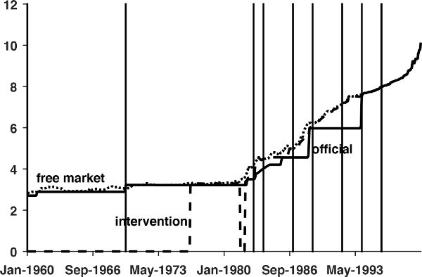Additionally, the official exchange rate—which had been fixed since 1970—was depreciated from 25 to 33 sucres per dollar in May 1982. This decision was complemented with a scheme of daily minidevaluaciones (crawling peg) in 1983. These depreciations had multiple objectives: one was to correct the real appreciation of the sucre due to the prolonged fixed exchange rate coupled with persistently high inflation since the 1970s; another was to provide the government with more sucres per barrel of oil exported; and finally, they also were aimed at discouraging imports due to the necessity to generate current account surpluses.
