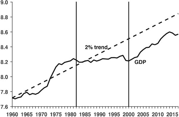 Figure 1. GDP per capita and 2 percent trend, 2010 US$, log scale