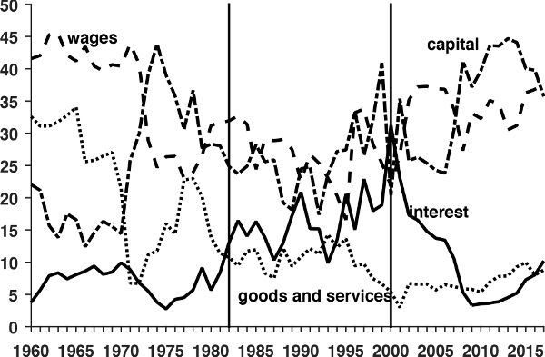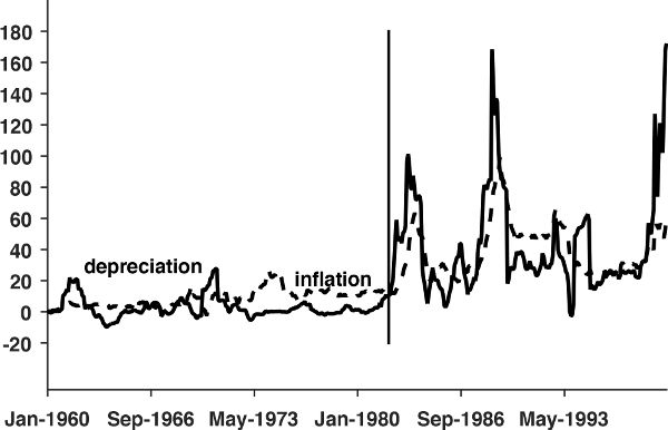 How were these obligations financed? The strategy favored during the previous period of resorting to foreign borrowing was rendered unfeasible because of the credit crunch derived from the Latin American debt crisis.17 Thus the government relied increasingly on seigniorage, which became the largest source of financing between 1985 and 1992. The growing dependence on seigniorage during the first half of the 1982–99 period was in turn matched by an increase in the average rate of inflation.