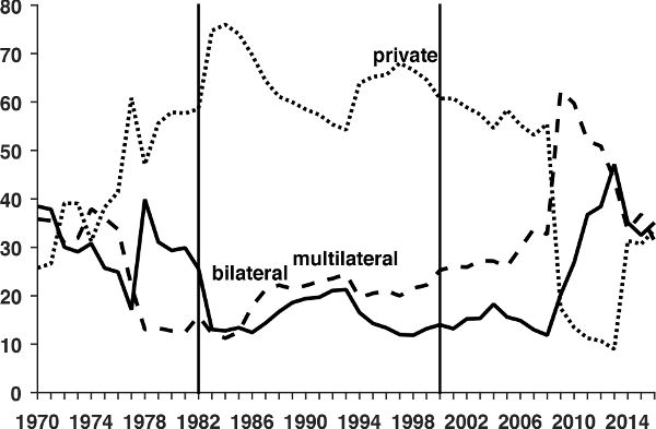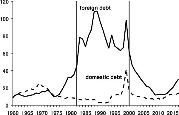 Note that during the early years of the debt crisis, there were significant increases in the foreign debt component. However, a large fraction of those additions was actually from the sucretización arrangement, by which the government took over the foreign debt originally contracted by the private sector.