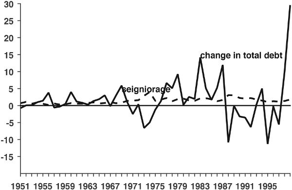 To conclude the analysis of the predollarization years, in Figure 14 we plot the two main sources of financing during this period—namely, the changes in total debt in equation (3) and seigniorage. We find that the two series are negatively correlated (with a correlation coefficient of −0.17), suggesting that debt and seigniorage were used as substitute—rather than complementary—sources of revenue.