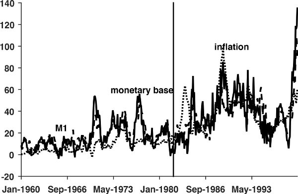 The average growth rates of the monetary base differ slightly relative to the values in Table 3 because the latter are based on annual values, whereas the former rely on monthly data.