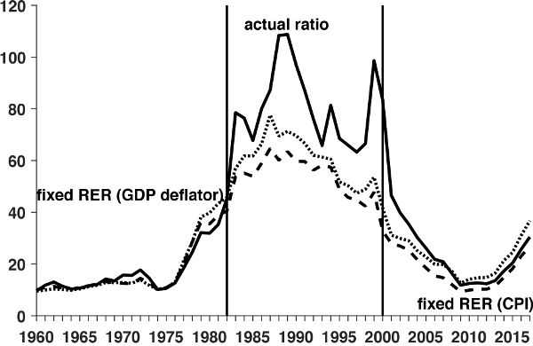 To assess the impact of those off-the-record expenses, we compare the actual path of the debt-to-GDP ratio with a hypothetical debt ratio computed under the assumption of transfers being zero in every year. This would reflect the borrowing needed to finance the deficits actually recorded. The two series are depicted in Figure 16. We find that prior to the establishment of the dollarization regime, the magnitude of the transfers term was significant (and positive), and thus the two series diverge noticeably, denoting the additional burden implied by the contingent liabilities. On the other hand, transfers have been negative on average since 2000, mainly because of the reduction in the stock of debt from the debt restructuring of 2001, the default of 2009, and the unilateral elimination of the debt with the central bank in 2008. Consequently, the actual debt ratio is significantly lower than the simulated one, denoting the “relief” provided by those events.
