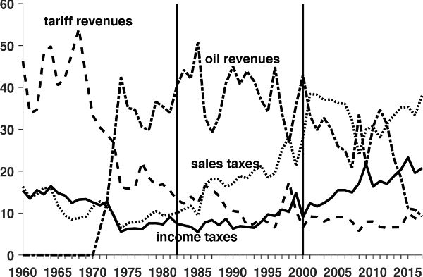 The bonanza period coincided with a series of military regimes that ruled the country from 1972 until 1979; these regimes used the oil windfall to redefine the role of the state, making it an active participant in the economy and the leader of the development process. Indeed, the revenues of the central government averaged almost 21 percent of GDP during the 1972–81 period—more than doubling the corresponding value from the previous period—with oil revenues accounting for nearly a third of the revenues (tax revenues represented 44 percent of total revenues on average during the same span). The rise in total expenditures was even more pronounced, averaging 23 percent of GDP during the period. Those expenditures corresponded mainly to public-sector wages (42 percent of total revenues), purchases of goods and services (26 percent), and capital expenditures (17 percent), mainly in large infrastructure projects such as highway and hydroelectric plant construction.