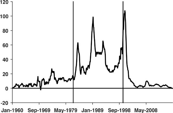 Those two events in turn define three broad economic eras, as displayed in Figures 1 and 2. The first period, which goes from 1960—the initial year in our study—until the end of the oil boom in 1981, was characterized by rapid growth and low inflation. Prior to the oil boom, the country had been growing at an average rate of nearly 5 percent per year (and roughly 2 percent in per capita terms). The oil boom provided a further boost to the economy, and output per capita surged well above the 2 percent per year growth trend. Furthermore, inflation was low, averaging 8.6 percent per year during the 1960–81 period (and only 4.9 percent if the oil boom period is excluded). While the boost to the economy from the oil boom led to an increase in the inflation rate, which averaged 12.9 percent between 1972 and 1981, that value was not very different from the one registered in the United States during the highly inflationary 1970s.