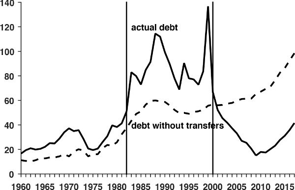 Figure 16. Total public debt, actual and without transfers, percentage of GDP