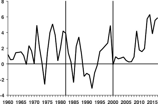 In this section, we document the most salient facts in Ecuadorian economic history for the period 1960 to 2017. We divide our analysis into the three aforementioned periods: 1960–81, the transition from the pre-oil economy to the oil boom of the 1970s; 1982–99, the two “lost decades”; and 2000–2017, the dollarized era. Additionally, we break down these periods into shorter subperiods because of the diverse approaches to economic policy adopted by the different governments.3