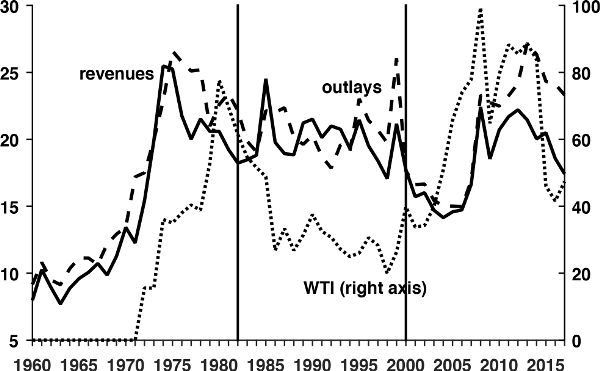 The oil boom of the 1970s changed those trends and led to a disproportionate increase in the size of the government and a surge in government deficits, as shown in Figure 3. In particular, the massive increase in the size of the government fueled by the oil boom was not accompanied by the creation of any substantial savings fund. This left the government’s accounts vulnerable to unexpected declines in oil prices. When crude prices eventually stopped surging in the late 1970s, the government intensified its external borrowing to sustain its inflated spending patterns—amassing a large amount of debt in the process—instead of implementing a fiscal adjustment. The credit crunch derived from the Latin American debt crisis of the early 1980s in turn rendered that strategy unfeasible, but yet again there was no significant fiscal correction. The remarkable downward inflexibility of government expenditures, in spite of a series of negative shocks—severe weather phenomena, banking crises, and oil price collapses—resulted in large fiscal imbalances, which by then included the additional burden of the debt. To finance the deficits, the government relied on seigniorage, and inflation ensued. The lack of any substantial and lasting fiscal adjustment continued through the 1990s. High inflation became entrenched, and the economy stagnated. Inflation only returned to low levels when the discretion to finance the deficits using seigniorage was removed by the establishment of the dollarization system.
