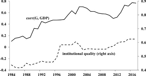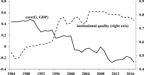 What may lie behind different degrees of cyclicality? Figure 3 points to institutional quality (which includes the quality of fiscal institutions) as a key determinant, by comparing Chile and Uruguay. The plot shows a twenty-year rolling window for an index of institutional quality and the correlation between the cyclical components of government spending and real GDP. In the case of Chile, the large improvement in the quality of institutions and the beneficial effects of the structural balance budget rule introduced in the year 2000 are readily apparent, as fiscal policy has become clearly countercyclical over the last two decades. In sharp contrast, Uruguay has become more and more procyclical over time, reaching a correlation of 0.77 in 2017.