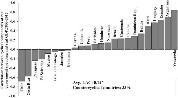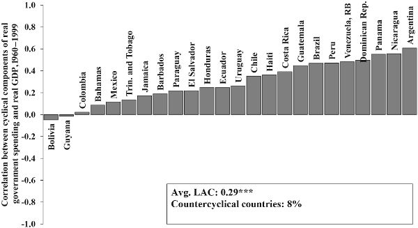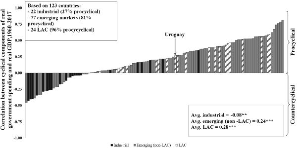 - All but one of the LAC countries have been procyclical, with an average correlation of 0.28 (significant at the 1 percent level). The arrow indicates Uruguay, which has been procyclical throughout this period.2