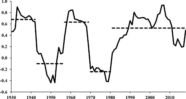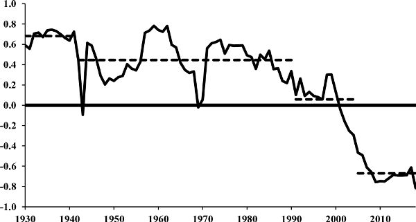 Finally, we take a really long-run view and compute fiscal cyclicality based on one hundred years of data for both Chile and Uruguay (Figures 4 and 5).4 The plot illustrates ten-year rolling windows of the correlation between the cyclical components of government spending and GDP. Further, we use the PELT algorithm (pruned exact linear time) to look for multiple change points in the fiscal cyclicality regime. In the case of Chile, we observe that the algorithm detects four different regimes, which become progressively more countercyclical over time, ending with an extremely countercyclical policy (partly reflecting the sharply countercyclical reaction to the global financial crisis of 2008–9). The case of Uruguay is the opposite. After alternating regimes, Uruguay has been consistently procyclical for almost four decades. The contrast with Chile could not be starker.