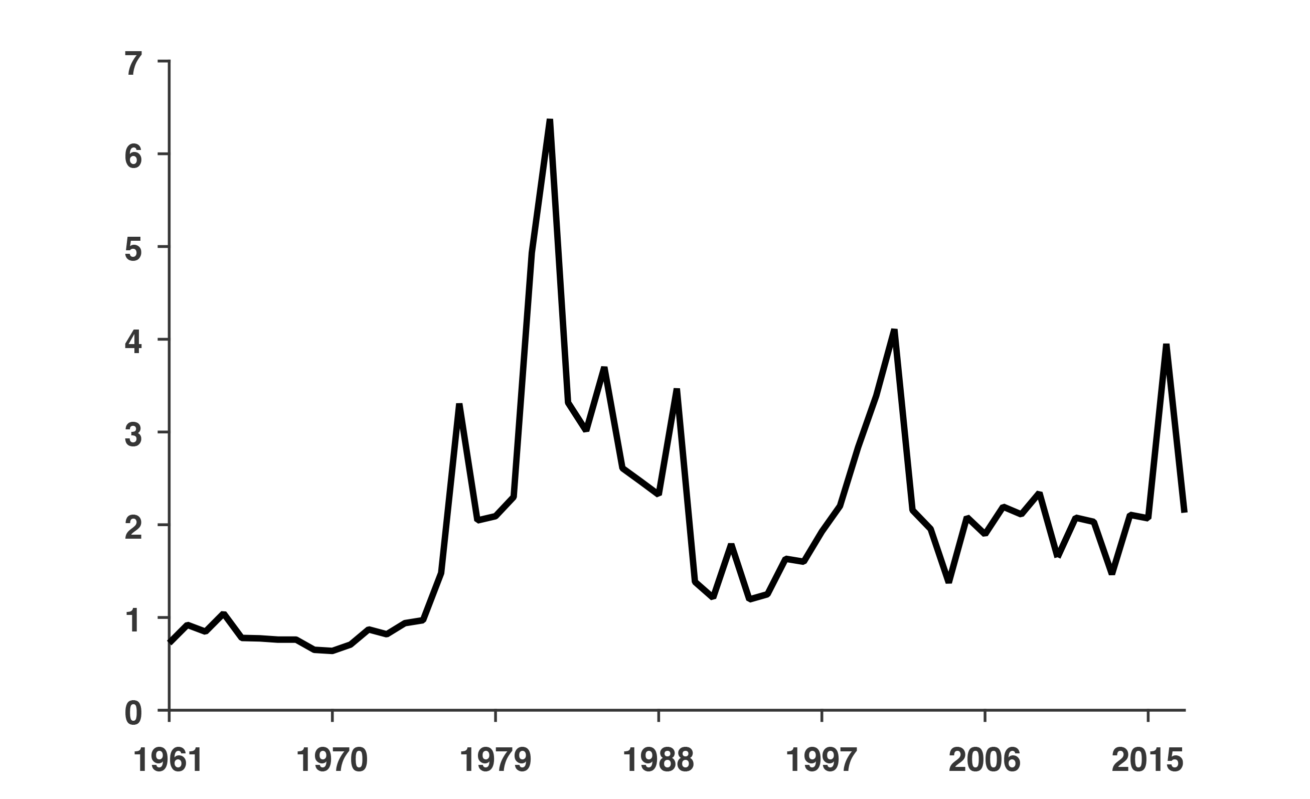 A comparison of figures 2 and 3 clearly shows that from the beginning of the sample until 1973, the deficit was moderately low, as was inflation. Healthy growth characterizes this period. In contrast, the very high- deficits–high-inflation period that started in 1973 and ended in 1991 coincides with the worst experience in terms of output growth, as figure 1 makes clear: per capita GDP, which had grown by around 30 percent from 1960 to 1973, went back in 1991 to the same level it was in 1960. After the sudden and very successful end of inflation in 1991, the economy ran for a decade with low inflation rates, a period that coincided with a remarkable convergence of output to the trend. Both the low inflation and the convergence to the trend ended abruptly with the 2001 crisis. The economy very quickly recovered from the crisis by 2003 and, at the same time, managed to keep inflation at very low rates until 2010. This period is accompanied, as figure 3 makes clear, by the lowest deficits for the whole period, averaging −0.4 percent and including six consecutive years with fiscal surpluses. This period coincided with a strong convergence of per capita GDP to the 2 percent trend. Then, after 2010, inflation started rising again, and per capita income stopped growing. Both events coincided with the worsening of the fiscal deficit.
