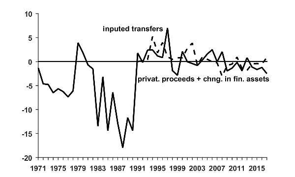 During the 1990s, the fiscal deficit is again larger than the flow of government financing. The adjustment is made by privatization proceeds, as illustrated in figure 11. The sale of state-owned enterprises is considered as a financing item “below the line” that implies less need for debt financing. Another important source of transfers since 1999 is a fiscal stability fund. We have performed a few counterfactuals regarding the level of debt, where transfers are kept at a level of zero, using information about transfers since 1990 (see online appendix A).