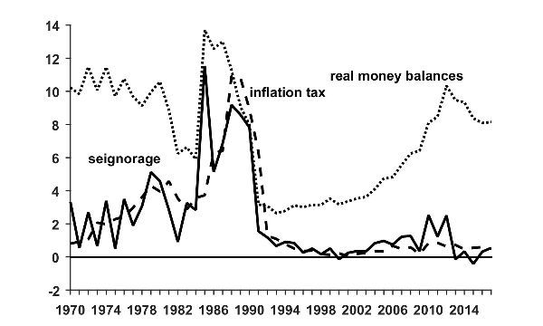 Figure 7. Real money balances, inflation tax, and seigniorage, percent of GDP