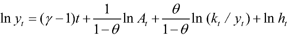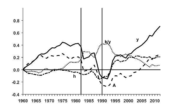 where yt, kt, and ht are GDP, capital stock, and total hours worked per working-age person. The first two terms in the right-hand side of equation (1) describe the trend and stochastic productivity factors. In figure 4 we use the decomposition given by equation (1) with data from Peru.1