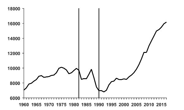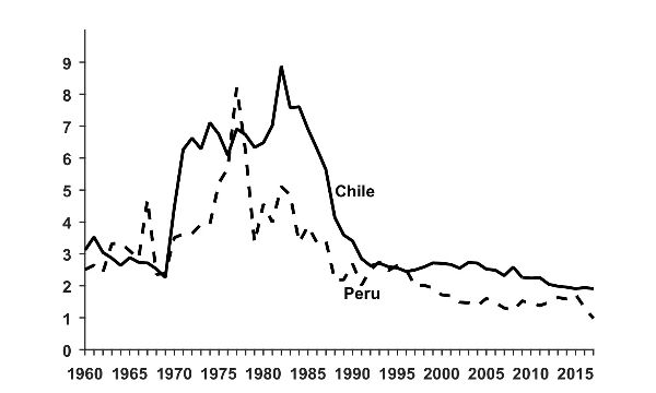 Inflation in Peru describes an extraordinary arc in the last half century, from a history of low inflation with periodic bouts of two-digit inflation, to chronic, accelerating inflation since the mid-1970s, to hyperinflation in the second half of the 1980s, culminating in the successful stabilization of the 1990s. By the turn of the century, deflation more than inflation was a worry for monetary authorities. The years of chronic inflation and hyperinflation were accompanied by a precipitous decline in GDP per capita, with a steady recovery in the last twenty-five years (see figures 1 and 2). Thus, the decade of the 1980s is marked by a hyperstagflation.