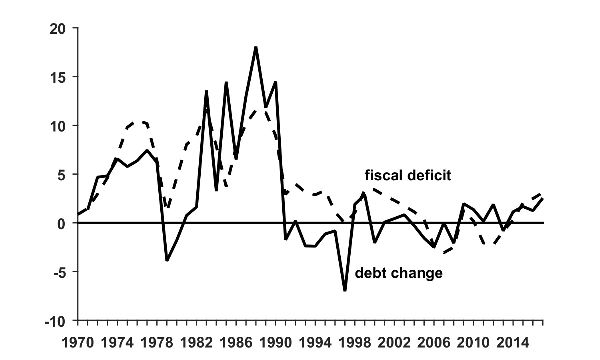 Figure 10 plots the fiscal deficit and the total flow of government financing (left-hand side of equation (2)), and figure 11 the transfers obtained as a residual. During the 1970s and the first half of the 1980s, the fiscal deficit is larger than the flow of government financing. This means that the government is financed from other sources; a key source is the credit of the financial public sector. As mentioned, the central bank would lend to state-owned banks, and these banks would lend to the nonfinancial public sector. In essence, this lending represents domestic debt that has not been properly recorded as such, nor repaid, and therefore acts as a hidden money source of financing. If we had included it in the overall debt position, total debt would have been much higher.