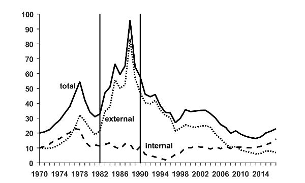 Figure 8 shows that domestic debt is negligible while external debt grows from about 25 percent in 1975 to a peak above 75 percent at the end of the 1980s. As in the case of government financing, short-term fluctuations in external debt as a percentage of GDP in the 1980s are a consequence of movements in the real exchange rate and GDP. The three peaks observed in the solid line correspond to three real exchange devaluation years. The first occurs in 1978 with a real devaluation of 20 percent, preceded by two years of lower devaluations. The second peak occurs in 1985, corresponding to a 29 percent real devaluation. The last peak occurs in 1988 with a 35 percent devaluation.