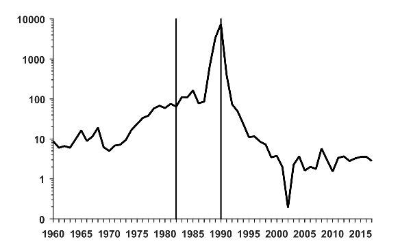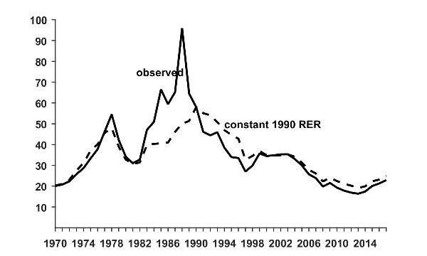 Isolating the effects of movements in the real exchange rate, public debt grew through the stagflation (figure 9). The country had been in arrears since the early 1980s, explicitly so since 1985, so there was no new foreign credit to the government. As argued in chapter 2, higher debt ratios may hamper the capacity to rely on more debt financing. In a sense, there is a limit to the capacity of the government to rely on external debt; reaching the limit implies ever more reliance on seigniorage, which is the key source of inflation.