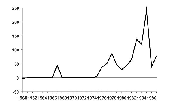 The evolution of the fiscal deficit during military rule, lumping together both phases of the Revolutionary Government, corresponds to the second cycle in figure 3. In spite of the fiscal effort, inflationary financing remained high during the Second Phase, corresponding to the plateau in the late 1970s in seigniorage in figure 6. Accordingly, inflation remained high, reaching near 67 percent in 1979 and 59 percent in 1980. These were historical records for the country (see table 3).