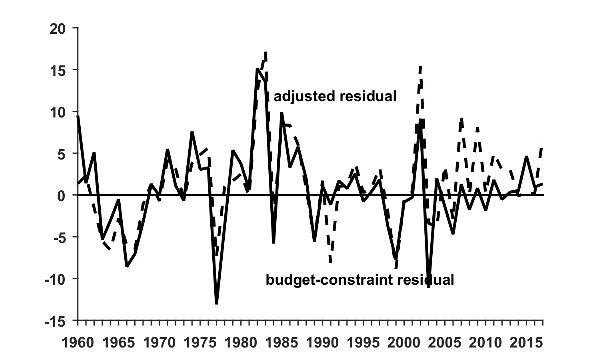 Figure 9. Adjusted and original residuals (% GDP). Note: “Adjusted residual” is defined as the budget constraint residual minus the explanatory factors.