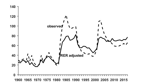 Nonetheless, since 2008, and especially after 2011, the primary surplus dropped (figure 4) in a context of strong GDP growth (5.1 percent in 2008–2014). That is, fiscal policy was not tight during the expansive phase of the cycle, while the wage policy attempted higher nominal rigidity in a context of full employment.36 All this contributed to the end of the golden years in 2014 with the consolidation of two imbalances: primary fiscal deficit and inflation above the central bank’s target range. The primary deficit averaged 0.3 percent of GDP in 2015–2017, and inflation remained above the target range between September 2011 and February 2017. In addition, the RER-adjusted public debt shows that the debt-to-GDP ratio is higher than the unadjusted one (figure 17), which implies that the effort to comply with public debt obligations could be larger than the observed one.