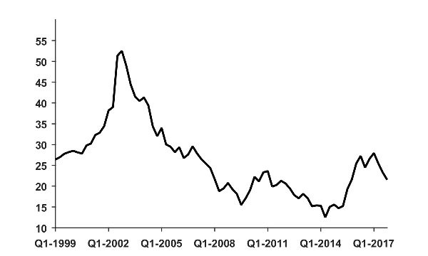 Figure 18. (M3—International Reserves) / GDP. Source: Data from Central Bank of Uruguay.