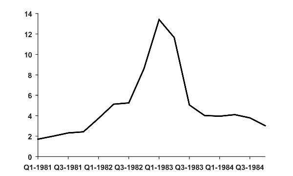 19. The central bank purchased nonperforming assets for US$1,141 million and issued US$755 million in public debt to Citibank and Bank of America (Vaz 1999). These agreements caused an increase in the quasi-fiscal deficit that reached 3.7 percent of GDP in 1984, almost half of the overall deficit of the public sector (Roldós 1994).