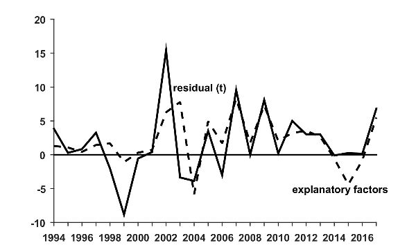 Figure 8. Residual and explanatory factors (1994–2017). Note: Between 1994 and 2017, the “explanatory factors” include net-of-credit deposits, financial assets and other extraordinary transfers (source: Central Bank of Uruguay).