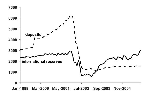 Between 1999 and 2001, the economy received an array of external shocks amid gradual restriction to external financing. At the beginning of 2002, the end of the convertibility in Argentina led to a run on bank deposits, especially from nonresidents, which caused a loss of international reserves (figure 19). Lower international reserves threatened the credibility of the exchange rate commitment and, thus, public debt service.