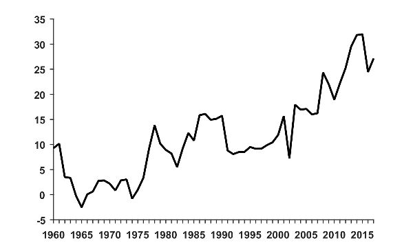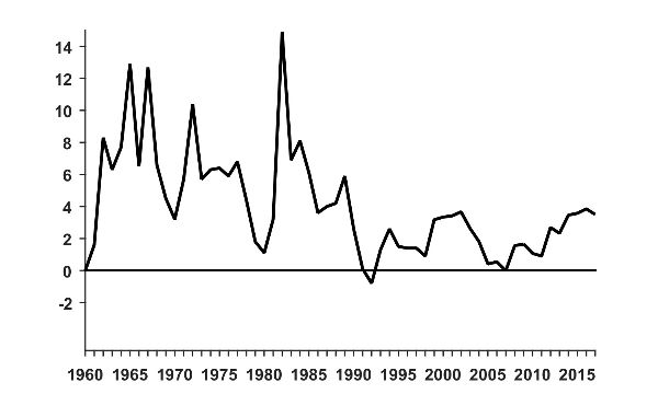 Between 1960 and 1973, the economy stagnated (figure 1) with high and volatile inflation (figure 2) and persistent fiscal deficits (figure 3).