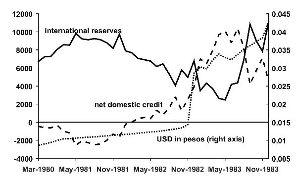 Amid this large bank run, the government created an explicit insurance scheme on peso-denominated bank deposits, converting them into contingent public debt. Also, there existed an implicit insurance on dollar-denominated deposits, so the total contingent liabilities for the monetary authority depended on the exchange rate as well.15 So, once bank runs intensified in 1965, the monetary authority had to monetize the deposits. And although deposits were falling, the frequent devaluations of the peso implied an increase in the number of pesos to be monetized.