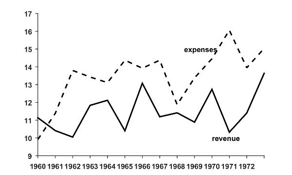 Figure 10. Central Government: revenue and expenses 1960–1973 (% GDP). Source: IECON.
