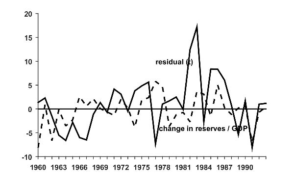 Figure 7. Residual and international reserves (1960–1993).
