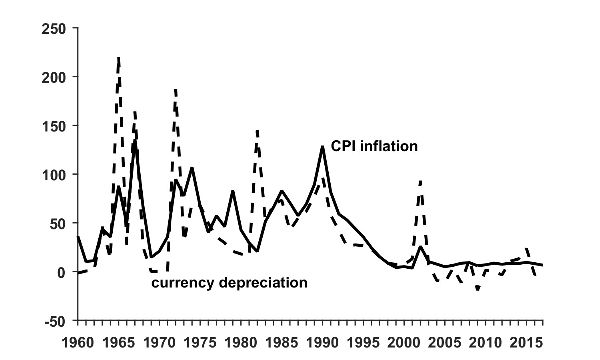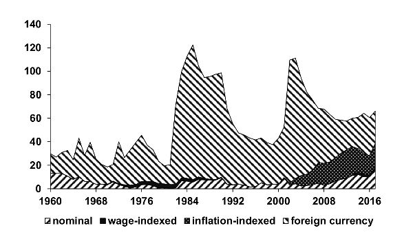 Between the 1960s and the late 1980s, chronic inflation was associated with large fiscal deficits. This caused nominal instability, which ended up triggering nominal rigidities (prices/wage indexation) and dollarization of financial assets. Both increased the financial vulnerability of the public sector and limited the ability of macroeconomic policies to stabilize the economy. Nonetheless, since the 1970s, but especially after 1991, the opening of the economy, financial liberalization, greater access to external financing, stabilization plans, and the more restrictive institutional framework of the central bank decreased the inflationary financing of fiscal deficits. Moreover, after the 2002 crisis, the lower share of foreign currency public debt reduced the vulnerability of the public sector.