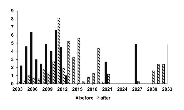 Figure 20. Public-debt service restructured in 2003 (% GDP). Source: Central Bank of Uruguay. Note: Estimated using GDP of 2002 and peso-dollar exchange rate of May 2003.